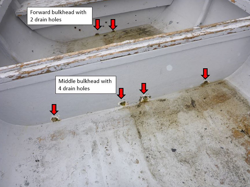 The forward and aft bulkheads are fitted with 2 semi-circular openings (9 cm in diameter) at deck level, and the 2 middle bulkheads are fitted with 4 circular openings (5 cm in diameter) to allow water to flow aft toward the vessel's transom. The transom is fitted with a drain hole, 2.5 cm in diameter, with a removable plug (Appendix A).