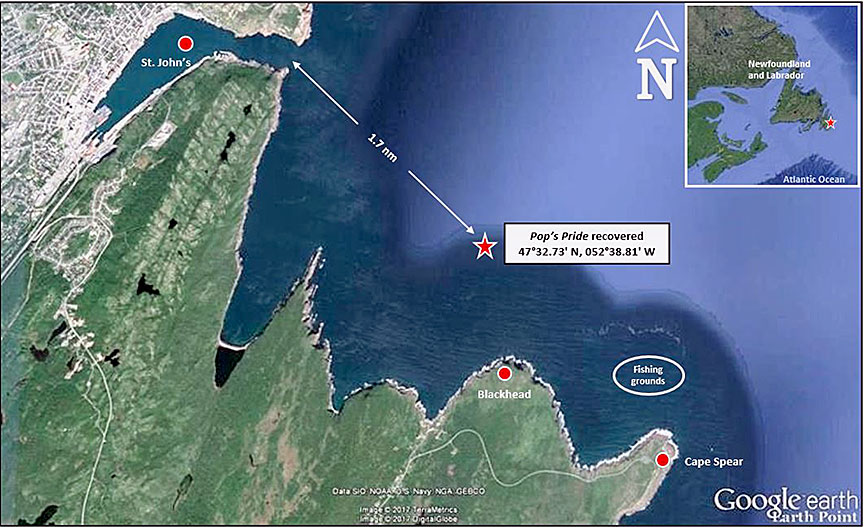 At about 0655Note de bas de page 2 on 06 September 2016, the Pop's Pride departed the small boat basin at the mouth of St. John's Harbour, Newfoundland and Labrador, with the master and 3 crew on board. Two of the crew were wearing personal flotation devices (PFDs). Although it could not be determined if the other 2 crew were wearing PFDs, they did have them and wore them regularly. The vessel headed east toward the cod gillnets the crew had set previouslyNote de bas de page 3 on Blackhead Bank, approximately 0.65 nautical miles (nm) north of Cape Spear and 2.9 nm southeast of the entrance to St. John's Harbour (Appendix B).