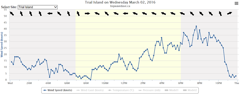 At 1930, the Trial Island lighthouse observation station, located 1.8 nautical miles east‑southeast of Clover Point, recorded a maximum wind speed of 48 knots with sustained winds of 40 knots.