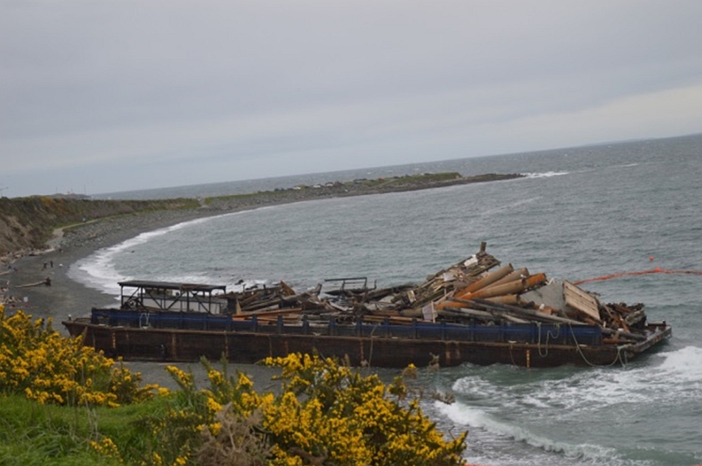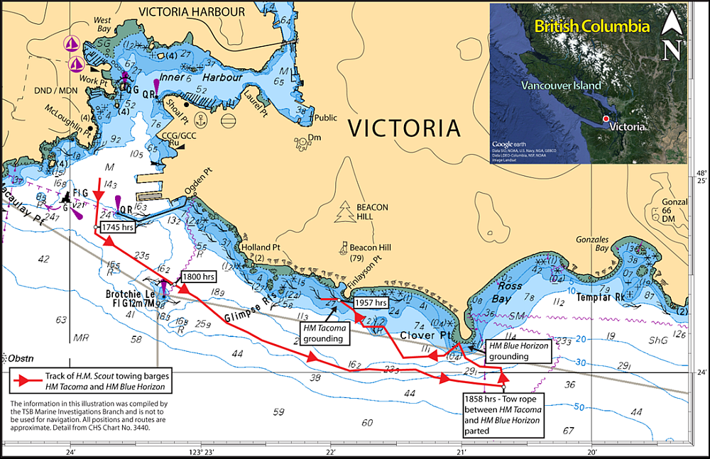At approximately 1858, the ropes connecting the HM Tacoma and HM Blue Horizon parted. The HM Blue Horizon started drifting toward the shore at Clover Point, which was 0.1 nautical mile (nm) away (Appendix B). The master turned the tug around and, with the HM Tacoma still in tow, began pursuing the HM Blue Horizon. He called the ownerFootnote 7 by cell phone and informed him that he had lost one of the barges. The owner began making calls to find a commercial tug to assist. At approximately 1903, the HM Blue Horizon grounded on the southwest side of Clover Point. At 1905, Marine Communications and Traffic Services (MCTS) attempted to contact the H.M. Scout by VHF radiotelephone but received no reply.