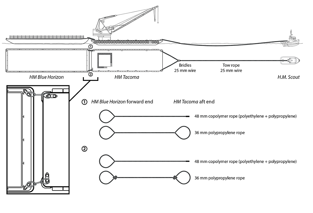 The H.M. Scout departed Victoria with the HM Tacoma and HM Blue Horizon in tandem tow. The 2 barges were connected using short, degraded synthetic fibre ropes of different diameter, length, and material. The ropes were made fast to bitts that were not aligned properly for towing and were not equidistant from the HM Tacoma's hull. The tow line between the tug and the first barge was also too short and did not provide catenary to dampen the effects of the dynamic motions between the tug and barge.