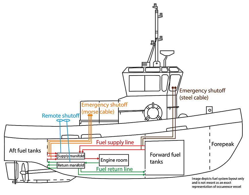 The engine room is equipped with two 600 hp diesel engines and an 11.3 kW diesel generator that drives 2 fixed-pitch propellers. An additional diesel engine provides power to drive the towing winch. The main distribution panels and switchboard are located on the forward bulkhead of the engine room. Within the engine room are 5 diesel tanks (2 forward tanks and 3 aft tanks) which, at the time of the occurrence, contained approximately 19 000 L of fuel. The tanks are fitted with supply and return valves in the engine room that can be remotely operated from the main deck by means of extended spindles connected to a manifold located on the starboard side. The fuel supply can be shut off at the supply and return valves, or, in an emergency, by means of remote levers operated from the wheelhouse or the main deck.
