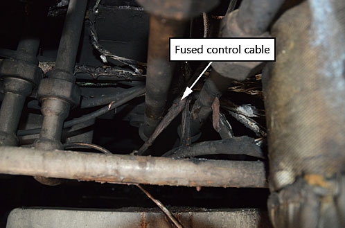 There was significant burning and charring of materials in the engine room, particularly around the generator. The heat from the fire melted and/or burned numerous components directly above the generator, and distorted some deck plating. The cable jacket and conduit liner of the control cables that operated the fuel shut-offs for the aft tanks were fused, rendering the cables inoperable (Figure 2). Both the cable jacket and the conduit liner were polyethylene-based.