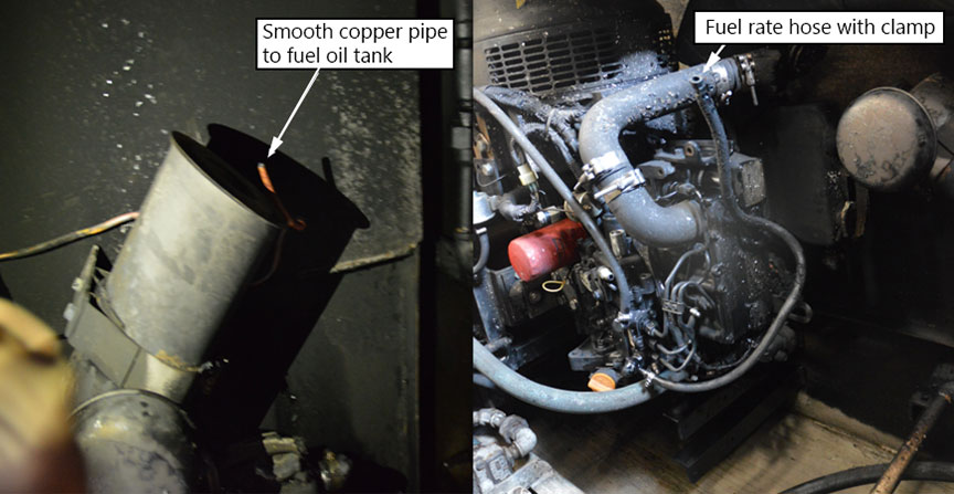 - There was no means of stopping the generator from outside the engine space in an emergency. The only way to stop the generator without entering the engine space was to shut off the fuel supply from the main deck. This would shut off the fuel supply to the entire engine room, in turn causing the main engines to shut down as well.