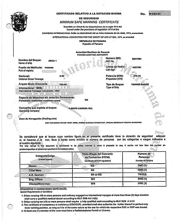 The Panama Maritime Authority issued a Minimum Safe Manning Certificate to the Arca 1 for a "single voyage from Sorel, Quebec, Canada, to Mazatlan, Sinaloa, Mexico, by coastal navigation." The certificate required the vessel to carry personnel with certification meeting the STCW requirements as detailed in Table 2.