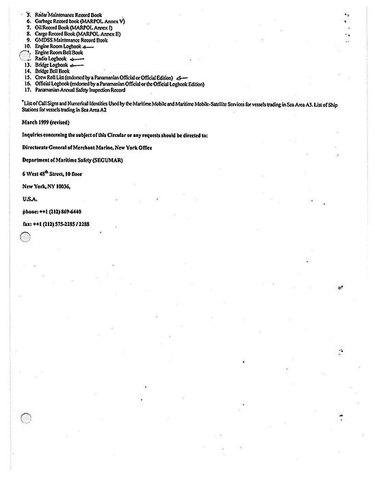 The vessel held a registry certificate as well as a Minimum Safe Manning Certificate and a Single Voyage for Delivery Authorization issued by Panama for delivery from Sorel, Quebec, Canada, to Mazatlán, Sinaloa, Mexico. The authorization specified that the vessel could carry out the voyage without statutory certificates. The vessel also held a radio station license.