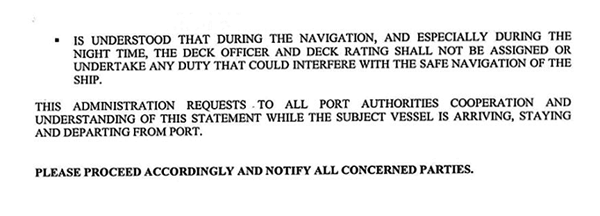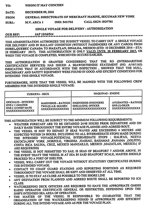 On 09 December 2016, the Panama Maritime Authority issued a Minimum Safe Manning Certificate (Appendix B) as well as a Single Voyage for Delivery Authorization (Appendix C). The authorization imposed, among other things, the following requirements to mitigate risks to the vessel and its crew: