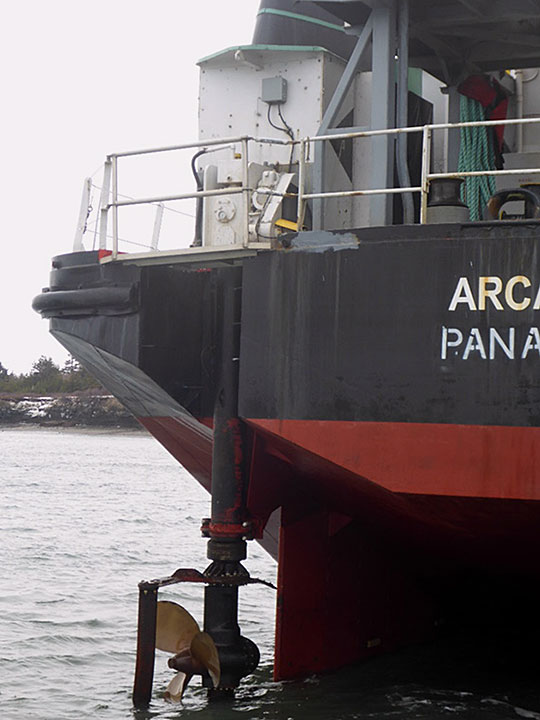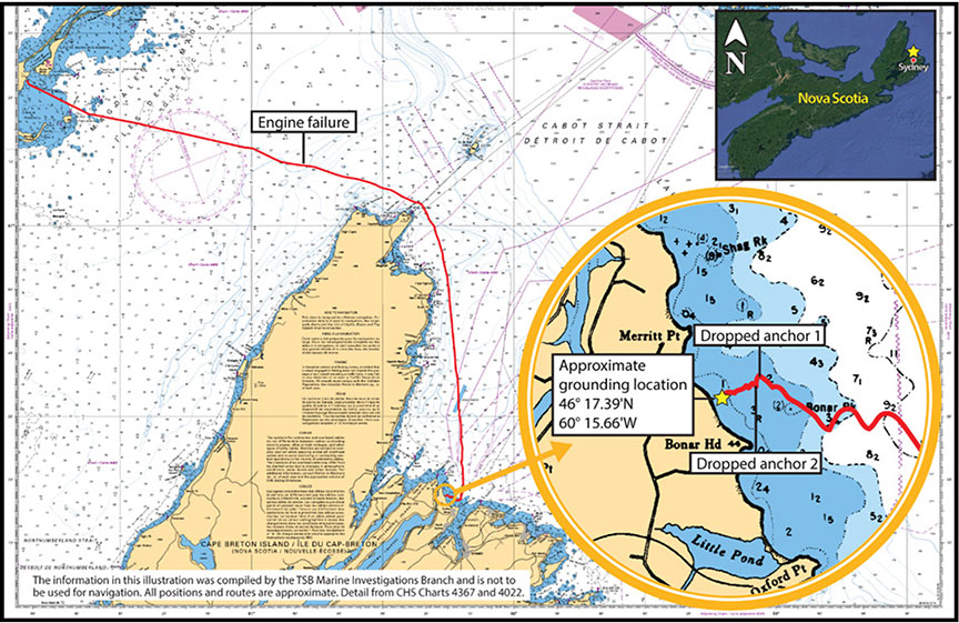 Shortly afterward, the anchor started to drag. The crew then raised the anchor to reset it. However, before they had a chance to do so, the vessel hit bottom, damaging the starboard Z-drive, and lost all means of propulsion. The anchor was dropped again but could not hold, and the vessel drifted closer to the shoreline until it grounded at 0811.