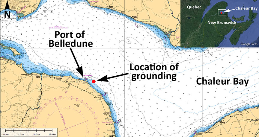 The Port of Belledune is typically approached from northeast to southwest with a breakwater forming the northern pier. The eastern edge of the southern pier ends along a bank that is featured on charts as a 10 m depth contour extending 1.5 nm to the east. There are no navigation aids marking the bank. The pilot on board the SBI Carioca typically approached the northern pier from a distance of approximately 2 nm and relied solely on visual aids such as landmarks on the shore for navigation.