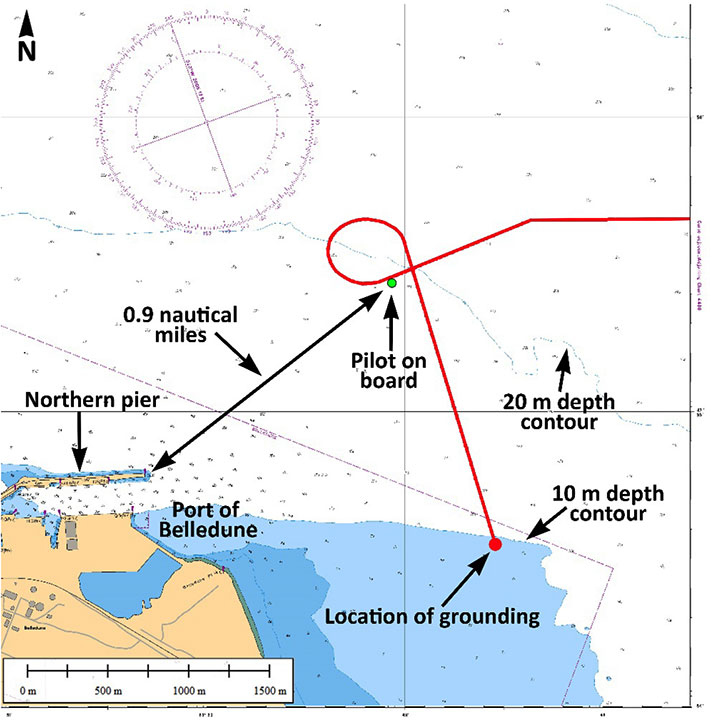 The bulk carrier SBI Carioca, with a draft of 12.65 m, ran aground inside a 10 m depth contour located near the Port of Belledune, New Brunswick, as the pilot manoeuvred the vessel to establish an approach to the port's pier.