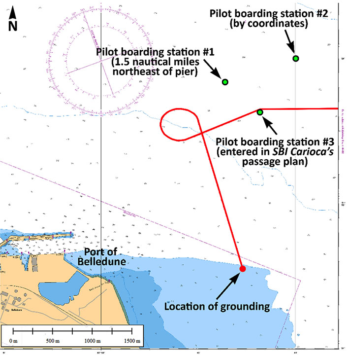 Because the pilot boarding station was not marked on any charts, the master ordered that the SBI Carioca proceed to an area approximately 1.5 nm northeast of the pier.