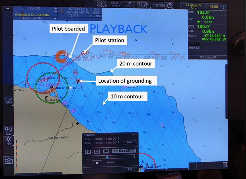 At about 0720, the SBI Carioca ran aground in position 47 54.559′ N and 065 48.562′ W. Shortly thereafter, the pilot checked the radar for the first time, and at approximately 0729, the pilot realized the vessel was aground. The course made good when the vessel ran aground was 175°, and the speed over ground was about 3 knots.