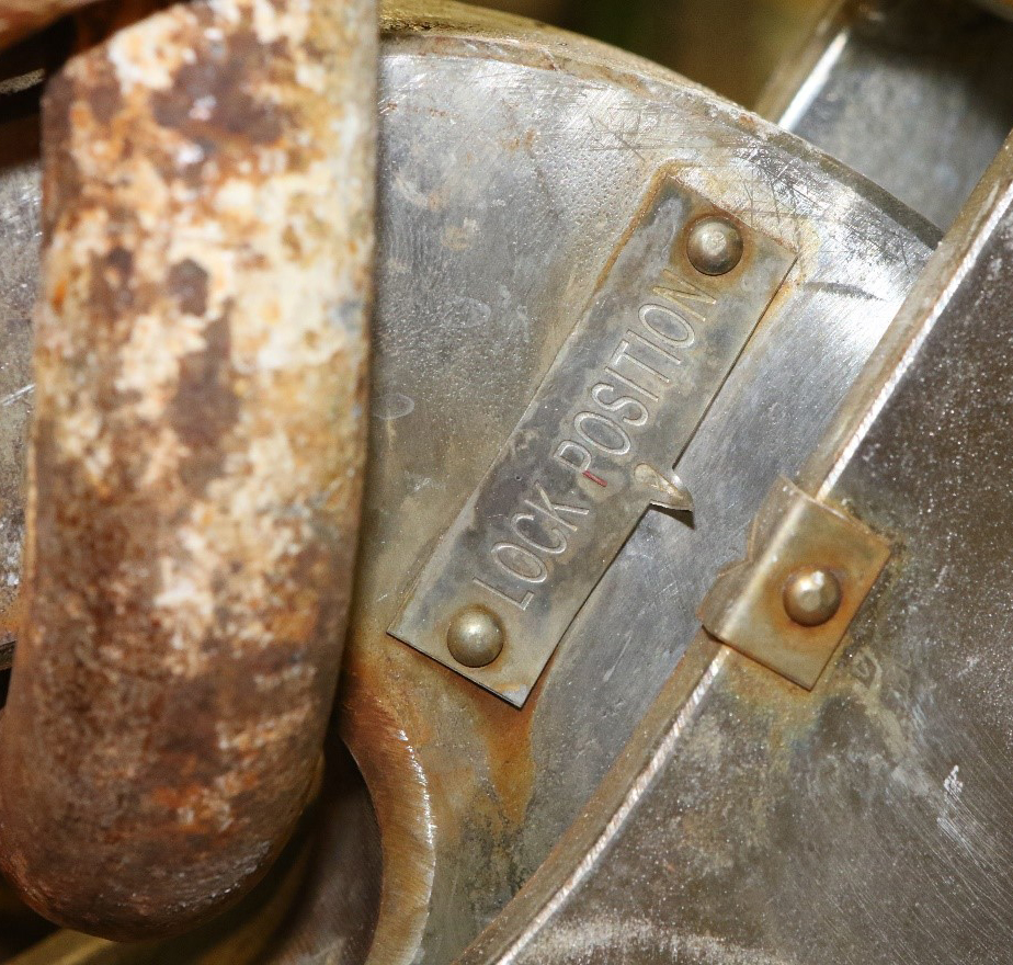 According to the manufacturer’s operation and maintenance manual, to reset the release hooks, the on-or off-load release mechanism operator moves release handle A back and forth while each hook operator manually rotates each release hook to the closed position.Footnote 6 As each hook rotates, it interacts with its blocking lever, moving the lever out of the vertical position. As the lever moves out of the vertical position, the tail of each hook enters the space between the side plates, then blocks its locking plate from rising until each hook is rotated such that its lock-position indicator aligns with the indicator on each hook’s side plate. During normal operation, when each hook and side plate indicators is aligned (Figure 8, Figure 9, and Figure 11), each hook’s tail is in line with the socket of its locking plate. When each hook’s tail is aligned with its locking plate socket, the locking plate is no longer blocked and is allowed to rise.