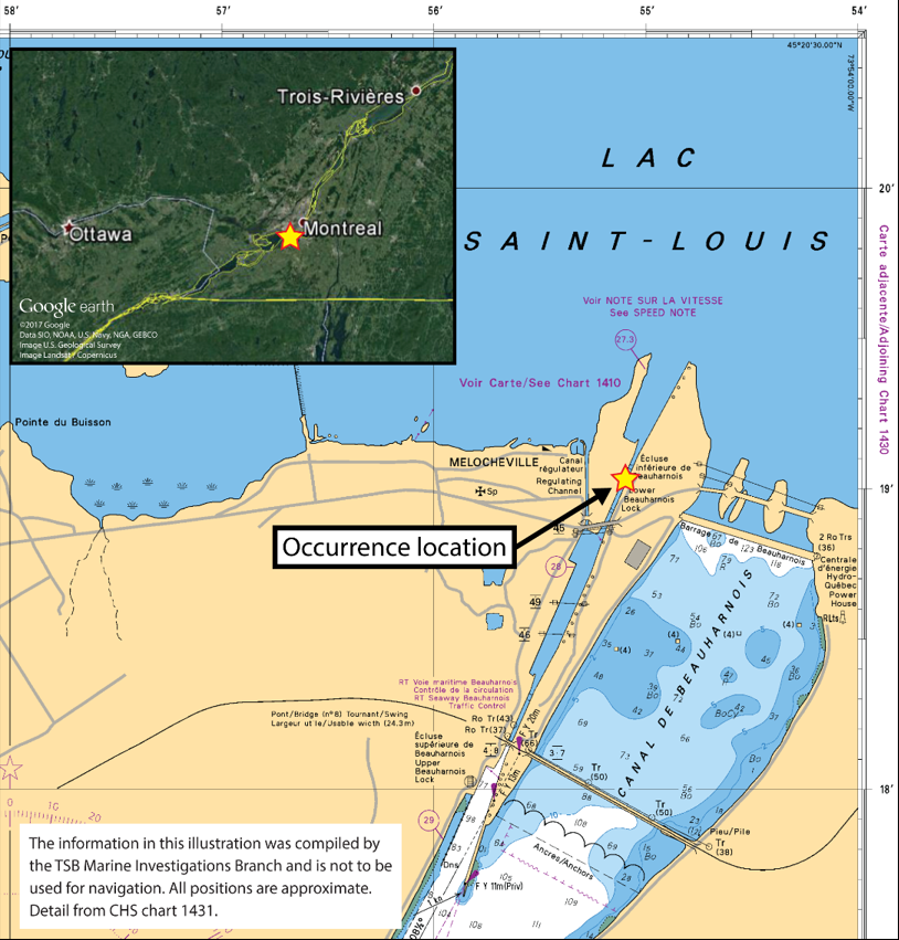 Around 0800Footnote 1 on 17 May, the vessel was exiting the Lower Beauharnois lock in the St. Lawrence Seaway under the conduct of a pilotFootnote 2 (Figure 2). This lock is 1 of 13 that form part of the Canadian section of the St. Lawrence Seaway facilities and that are managed by The St. Lawrence Seaway Management Corporation (SLSMC).Footnote 3 The lock operator is located in a remote control station in Saint-Lambert, Quebec.