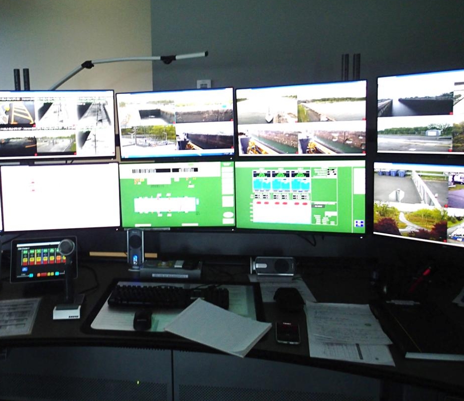 The workstation camera layout in the remote control centre is similar to that of the workstations at the locks. Each workstation has a number of closed-circuit television cameras and applications to allow lock operators to view all equipment (Figure 3). These control stations include screens displaying video feeds of the lock or canal structure, perimeter security cameras, the traffic management system, the automatic identification system, vessel traffic, and the hands-free mooring system.
