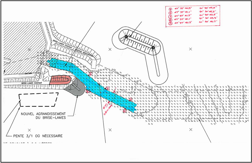 Approximately 45 fishing vessels operate out of Grosse-Île harbour. Navigation between the harbour and the sea is through an unmarked dredged channel that is 50 m wide and 415 m long. No buoys or other aids to navigation are used to mark the channel. In 2012, an offshore island breakwater was installed (Figure 3) and an extension was added in the fall of 2016. This extension required shifting the unmarked channel south of and parallel to its original location prior to the opening of the 2017 fishery (Figure 4).