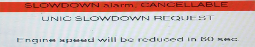 When the main engine shutdown button was activated on the touch screen, a generic system status message appeared on the touch screen, stating "SLOWDOWN alarm. CANCELLABLE UNICFootnote 2 SLOWDOWN REQUEST[.] Engine speed will be reduced in 60 sec"Footnote 3 (Figure 3). The message did not specify that the engine was about to shut down, nor did it indicate how the shutdown was activated or from where (bridge, engine room, emergency stop, etc.).Footnote 4