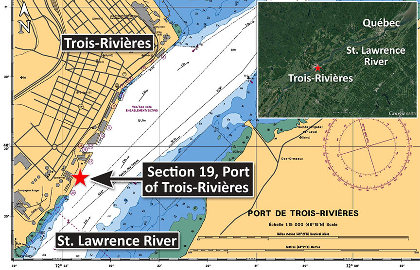 On 29 September, at 2200, the wind in Trois-Rivières was from the north at 6 knots. The air temperature was 7 °C, and the water temperature was 19.6 °C. The sky was overcast, and visibility was 9 nautical miles (nm). Near Section 19 of the Port of Trois-Rivières, the current was 1.5 knots,Footnote 4 and the wave height was 0.3 m to 0.6 m.