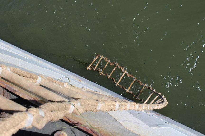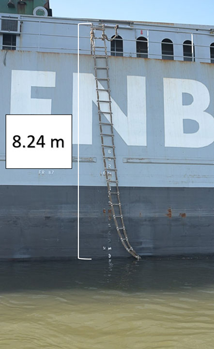During their search, they found the Jacob's ladder used in the initial draft survey lowered and hanging over the port side at amidships. The last few rungs of the ladder were in the water and moving with the current (Figure 2 and Figure 3). A crew member found the draft measuring tape on the port side of the main deck (Appendix A).