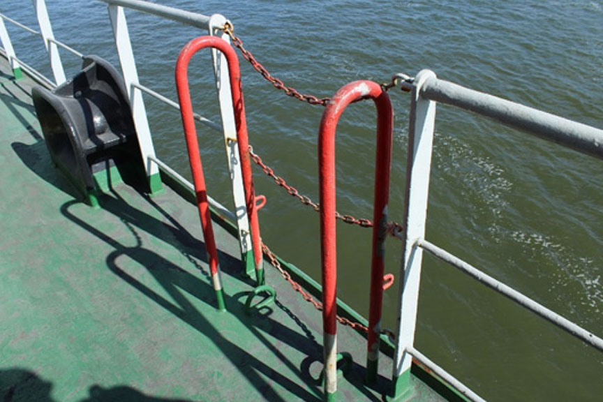 In accordance with SOLAS, the Amazoneborg’s guardrail is equipped with 6 gateways at various locations for pilot and embarkation ladders (Figure 4). Each gateway is fitted with a removable chain or gate and handhold stanchions. The handhold stanchions and the securing strong points are permanently welded to the main deck. They ensure a safe means of transferring between the ladder and the deck. None of these gateways are aligned with or near the vessel’s amidships draft marks.