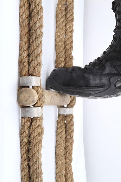 At the time of the occurrence, 2 Jacob's ladders were on board the Amazoneborg. They were made up of round wooden rungs inserted between manila ropes and attached with aluminum clamps. The ladder used in the occurrence was 9.4 m long, with rungs 34 mm in diameter and 400 mm long. When resting on a flat surface, other than the areas immediately surrounding the clamps, the ropes lie flat. The distance from the flat surface to the outer edge of the rung is 42 mm, which provides a toehold of approximately 25 to 35 mm (Figure 5).