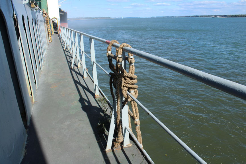 The Jacob's ladder used in this occurrence was rigged to the guardrail, above the amidships draft marks (Figure 6). This portion of the guardrail consisted of permanent rails and stanchions. On board the Amazoneborg, Jacob's ladders were typically rigged in this manner. During installation, the length of the ladder was typically adjusted according to the vessel's freeboard so that it hung above the water. To transfer between the deck and the ladder, the user had to climb up the guardrail, straddle it briefly, and then descend the guardrail. The permanent guardrail is intended to prevent personnel from falling overboard and is not intended to secure a ladder.