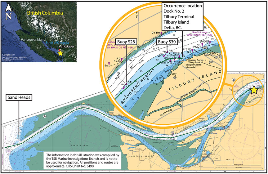 Meanwhile, the relief master began monitoring 2 downbound tugs with a barge that were entering the channel from a terminal located across the river from the Tilbury terminal. The Seaspan Greg, another company vessel, was inbound for berth No. 4, ahead of the Seaspan Swift. At some point, the masters of the Seaspan Reliant and the Seaspan Swift communicated to slightly modify the passing arrangement so that the Seaspan Reliant would pass inside Buoy S30, allowing more room for the 2 tugs and the barge that were now in the channel.