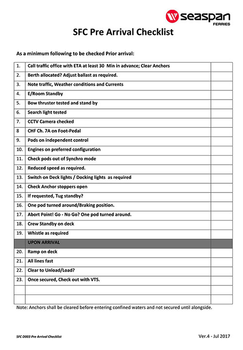 - Input to the pre-arrival checklist was requested from company employees on significant changes that affect the fleet operations.