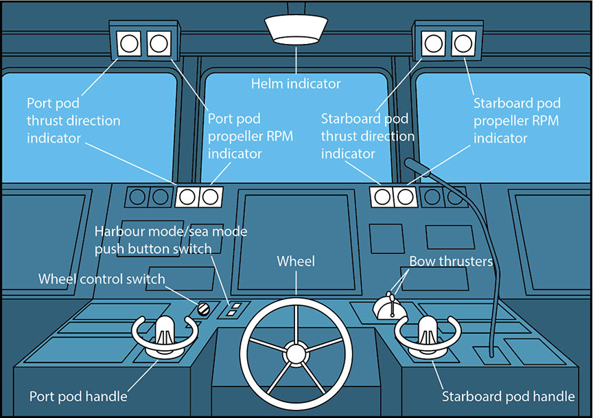 The propulsion and steering controls are located on the bridge. The vessel has 2 manual steering controls: a wheel and pod handles. The pods have varying degrees of rotation depending on which type of mode (harbour/sea) or steering control (wheel/pod) is in use.Footnote 3 The vessel also has an autopilot.