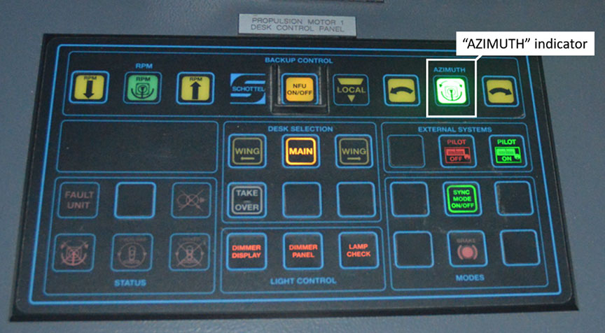 At the time that the relief master rotated the port pod handle, there were visual cues to indicate that the steering control was set to the wheel. The position of the selector switch was set to wheel control, and both of the green LED lights above the wheel control switch were illuminated. The green “AZIMUTH” light to indicate that steering control was set to the pod handles was off. However, the azimuth light does not stand out among the other displays, and stands out even less when it is not lit. Invariably, the physical action of moving a control gives an operator the impression that the input was successful, even if it was not. As a result, the operator may not always look carefully at the available displays for confirmation of steering control.