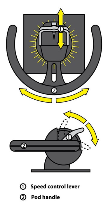 Levers for increasing or decreasing the speed of the propellers are located on the pod handles (Figure 7 and Figure 8). The levers are unidirectional and can move only from 0° (located at the centre of the lever) to a maximum of 90° (located at 1 end of the lever). The speed control levers are the only means of increasing or decreasing propulsion on the vessel and are used either when the operator is steering with the wheel or when the operator is steering with the pod handles. The propellers rotate in 1 direction only.