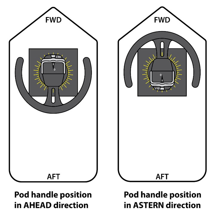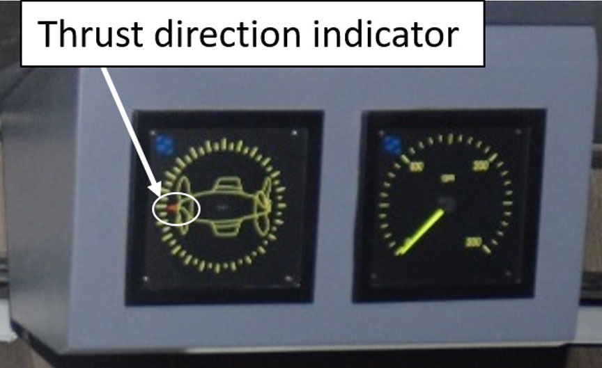 There are 4 sets of indicators on the bridge to show thrust direction and the rpm of the pod (Figure 9). Two are located on the main console near each of the pod handles, and 2 are located above the forward-facing bridge front windows (the indicator for the port pod is on the left side and the indicator for the starboard pod is on the right side). The thrust direction indicators show an unmarked 360° rotary scale with a 2-propeller pod image and a red triangle-shaped pointer that indicates the direction of thrust from the pod (Figure 9).