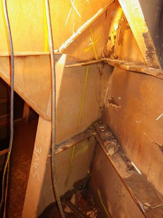 As a result of the collision, the FRPD 309 sustained damage to the shell plating (Figure 2) and forepeak tank forward of the collision bulkhead (Figure 3). Additionally, the port anchor was disconnected from its housing and became wedged in the Evco 60's hull. The Evco 60 also sustained structural damage due to the impact of the collision (Figure 4).