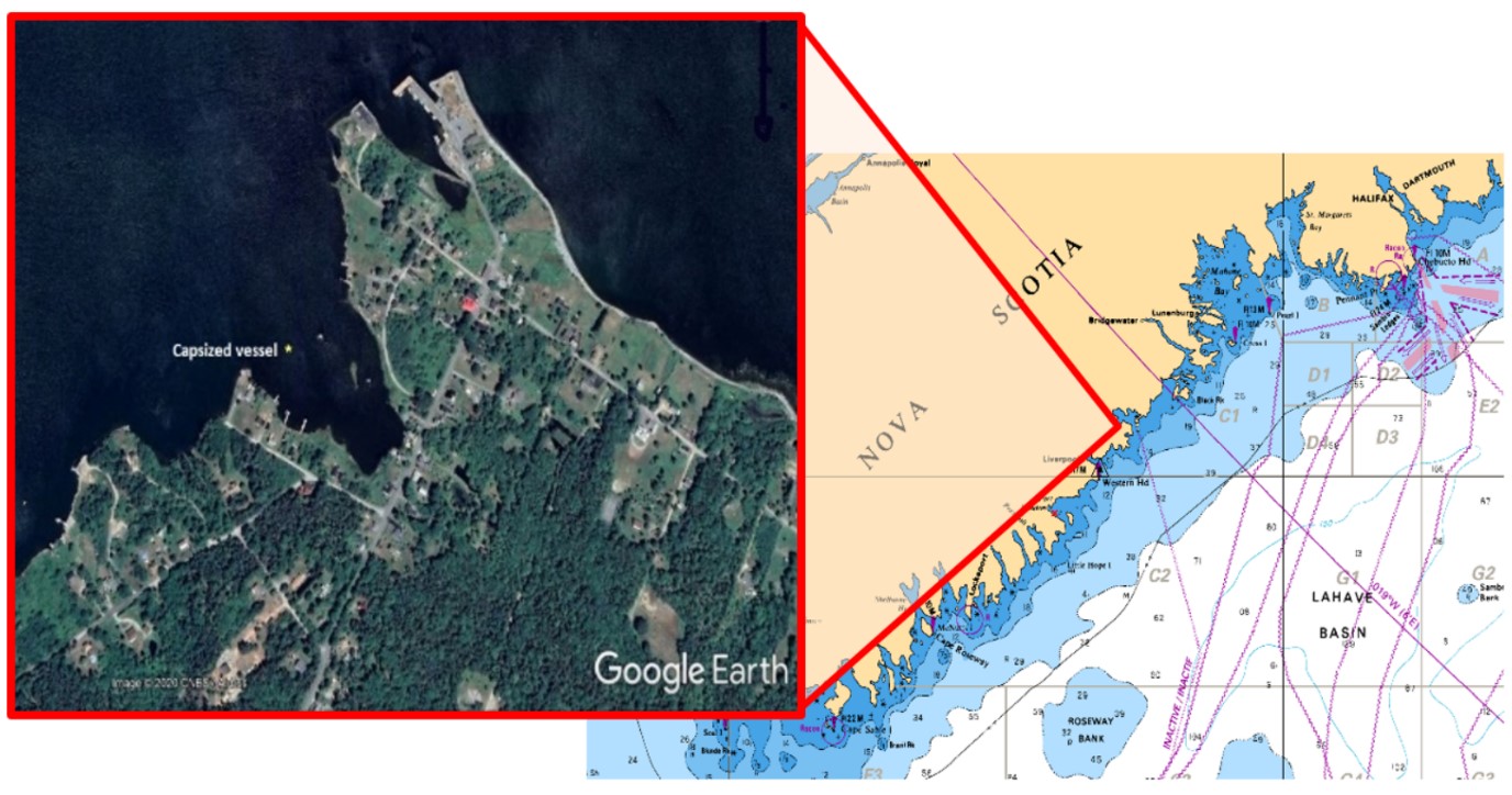 Shortly after 1000, the Royal Canadian Mounted Police (RCMP) received a call that a small fishing vessel had overturned 0.04 NM northeast of Beach Cove, Port Medway, Nova Scotia (Figure 2). Locals knew this area was near where the master of the fishing vessel stored his crab crates, leading them to believe it was his vessel. The RCMP called the Joint Rescue Coordination Centre Halifax and a search was launched. The search involved the RCMP, a fast rescue craft from the Liverpool fire department, a Department of Fisheries and Oceans fast rescue craft, a local fishing vessel, a Joint Rescue Coordination Centre helicopter, a fixed-wing aircraft from 14 Wing Greenwood, Nova Scotia, and a local shore-based search and rescue crew that included members of the community.