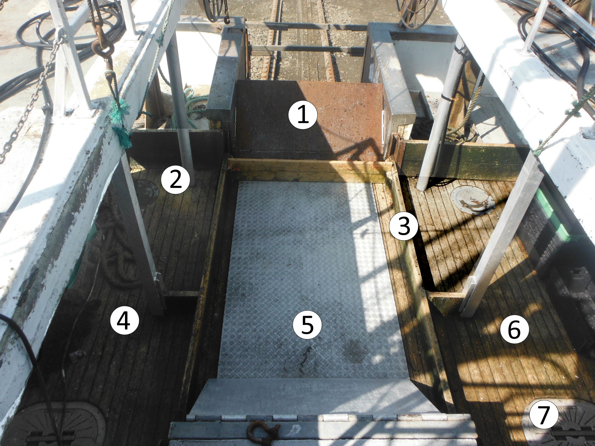 The vessel also had a main deck with bulwarks and a stern ramp. The stern ramp had a steel gate that could be hydraulically raised and lowered (Figure 2). There were 6 freeing ports in the bulwarks around the main deck. The main deck could be divided into sections using pound boardsFootnote 1 to facilitate sorting the fish on deck, as well as directing the fish into the desired hatches (Figure 2). The main deck had 1 non-watertight main hatch with a coaming that provided access to the fish hold via a ladder, as well as 8 other smaller flush watertight hatches that opened into the fish hold.