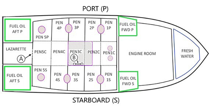 The Atlantic Sapphire carried a stability booklet that had been developed in 2013, and approved by TC. The stability booklet included 7 examples of stability conditions related to different vessel loading situations. One of the stability conditions described the vessel departing the fishing ground with a full load of fish and accompanying ice required to keep the fish cool (called the full load condition). The vessel’s maximum load of fish and ice combined was 36.51 long tons (consisting of ⅔ groundfish and ⅓ ice). The stability booklet specified that, in full load condition, the fifth row of pens, pen 3C, and pen 4C were to be kept empty while the other pens were loaded to 90% capacity. The maximum load of fish and ice was calculated with 25% of the maximum amount of fuel and water remaining in the vessel’s tanks. The stability booklet included a note that the fish hold was to be permanently marked to identify the point at which it was 90% full.