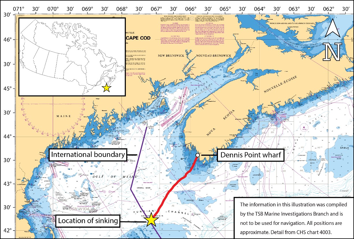At 2329, Joint Rescue Coordination Centre in Halifax received a signal from the Atlantic Sapphire’s EPIRB. Search and rescue coordinators retrieved the vessel’s registration information and tried to contact the vessel, the vessel owner, and other vessels in the search area. At 2349, the rescue centre received a phone call from the vessel owner and was informed that the Atlantic Sapphire had sunk, and that the crew was safely on board the Angela O.