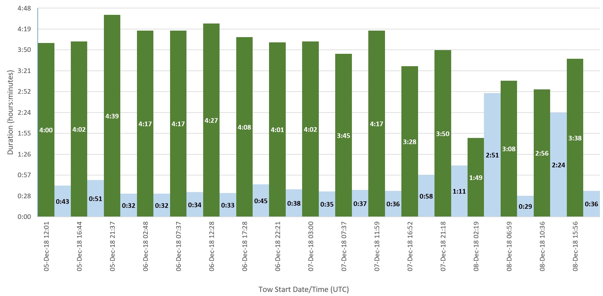 For the fishing trip from 05 to 09 December 2018, the vessel fished for 3 consecutive days. During those 3 days, the longest period of rest possible was 4 hours 39 minutes, with an average tow time of 3 hours 49 minutes (Figure A1). This does not take into account the time required to complete deck duties, clean up, eat, and change before actually resting.