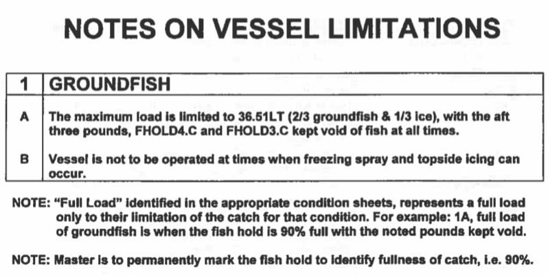 The crew followed certain aspects of the guidance in the stability booklet, such as consuming fuel from the aft fuel tanks first, maintaining an even keel when loading the fish hold, using penboards, and loading the forward pens first. Other aspects of the guidance were not followed consistently; for example, the combined weight of fish and ice loaded into the fish hold frequently exceeded 36.51 long tons, and the fish hold was not permanently marked to indicate the point at which it was 90% full.