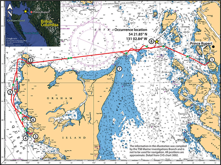 At 1051, the first CCG vessel, the Cape Dauphin, arrived on scene as the Western Commander continued to list to port (Figure 2). The CCG crew stabilized the mate and transferred him to the RCM-SAR 64 vessel, which evacuated him to Prince Rupert at 1120. At 1212, the RCM-SAR 64 vessel arrived in Prince Rupert and transferred the mate to emergency health services. The mate was pronounced dead on arrival at the hospital.