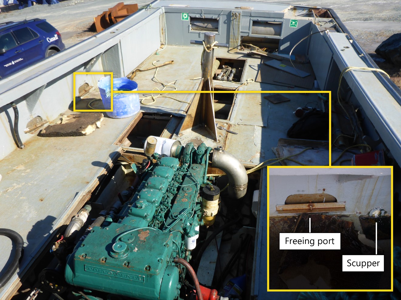At some point on the return voyage to Eastern Passage, unbeknownst to the crew, sea water began entering the vessel through an open freeing port. The amount of water that entered the hull exceeded the capacity of the bilge pumps and flooded the area below the deck.