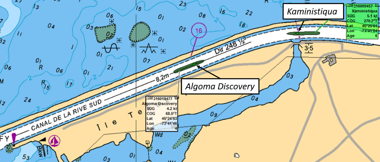 At 0646:23, as the Kaministiqua was altering its course away from the centre of the canal, the Algoma Discovery was approaching the curve at a speed of 4.9 knots. The Algoma Discovery was positioned close to the centre line of the canal, and the vessels were approximately 0.4 NM apart (Figure 4). The master of the Algoma Discovery made a VHF call to the Kaministiqua, requesting that it give the Algoma Discovery more room. The Kaministiqua did not acknowledge the Algoma Discovery’s call.