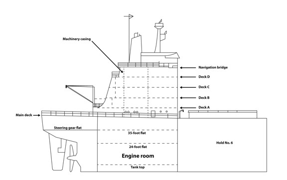 The middle deck, called the 24-foot flat (Figure 4), provides access to the auxiliary engines, various ancillary equipment, the purifier room, the engine control room (ECR), and the top part of the main engines. The lower deck, called the tank top, provides access to the lower part of the main engines and to other ancillary machinery. It also includes a maintenance opening for the emergency fire pump compartment.Footnote 2