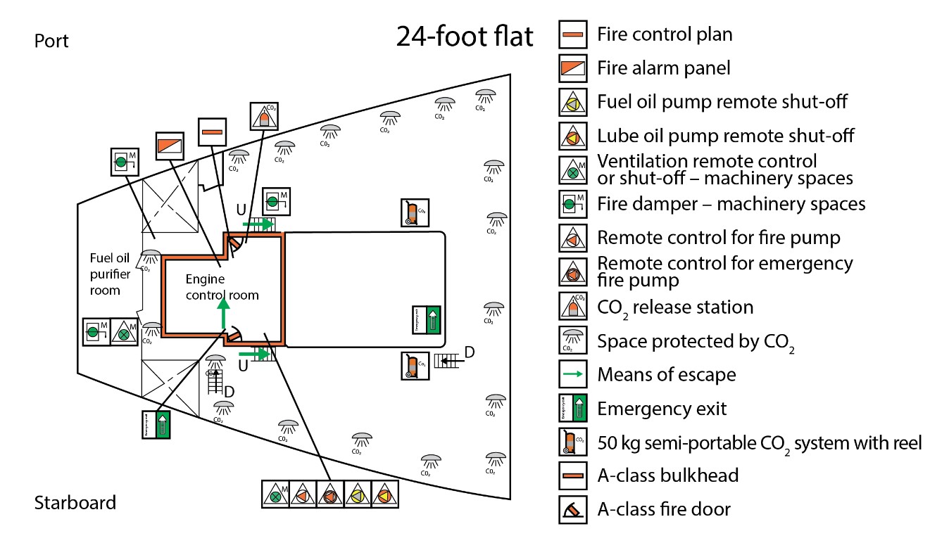 - The fire control plan had not been updated to show the current state of the vessel. For example, it showed 4 firefighter outfits instead of 2, it did not indicate the location of the foam applicator, and it incorrectly showed the maintenance opening to the emergency fire pump compartment in the engine room as a door.