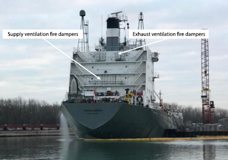 The engine room has both supply and exhaust ventilation. The supply ventilation provides fresh air to the engine room and has intakes on the aft exterior side of the superstructure on deck B. The exhaust ventilation dispels heat and fumes from the engine room and has exhaust openings on the aft exterior side of the superstructure on deck D. The supply and exhaust ventilation openings are fitted with fire dampers (Figure 5) to isolate the engine room in case of a fire.