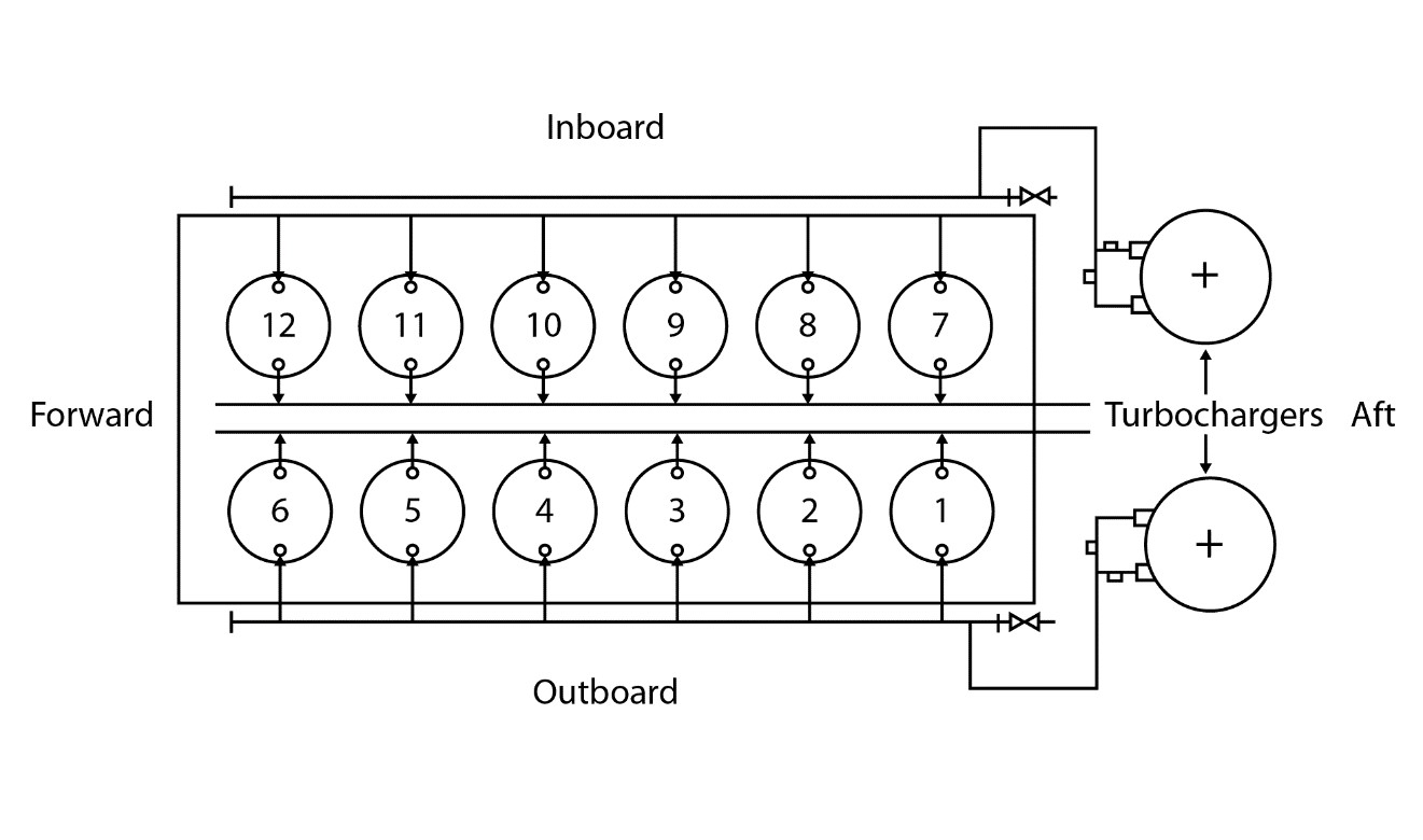 The Tecumseh’s propulsion is provided by two 12-cylinder V-type unidirectional trunk–piston type diesel engines, each with twin turbochargers. One engine is located on the port side of the engine room, and the other is located on the starboard side. On the port main engine, cylinder units No. 1 to No. 6 are located on the outboard cylinder bank, while cylinder units No. 7 to No. 12 are on the inboard bank (Figure 6).