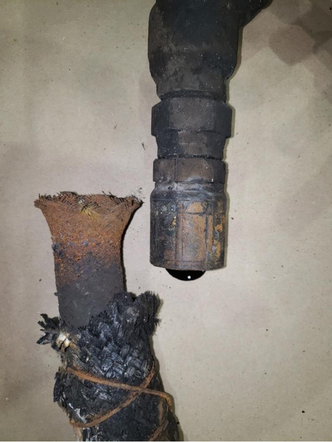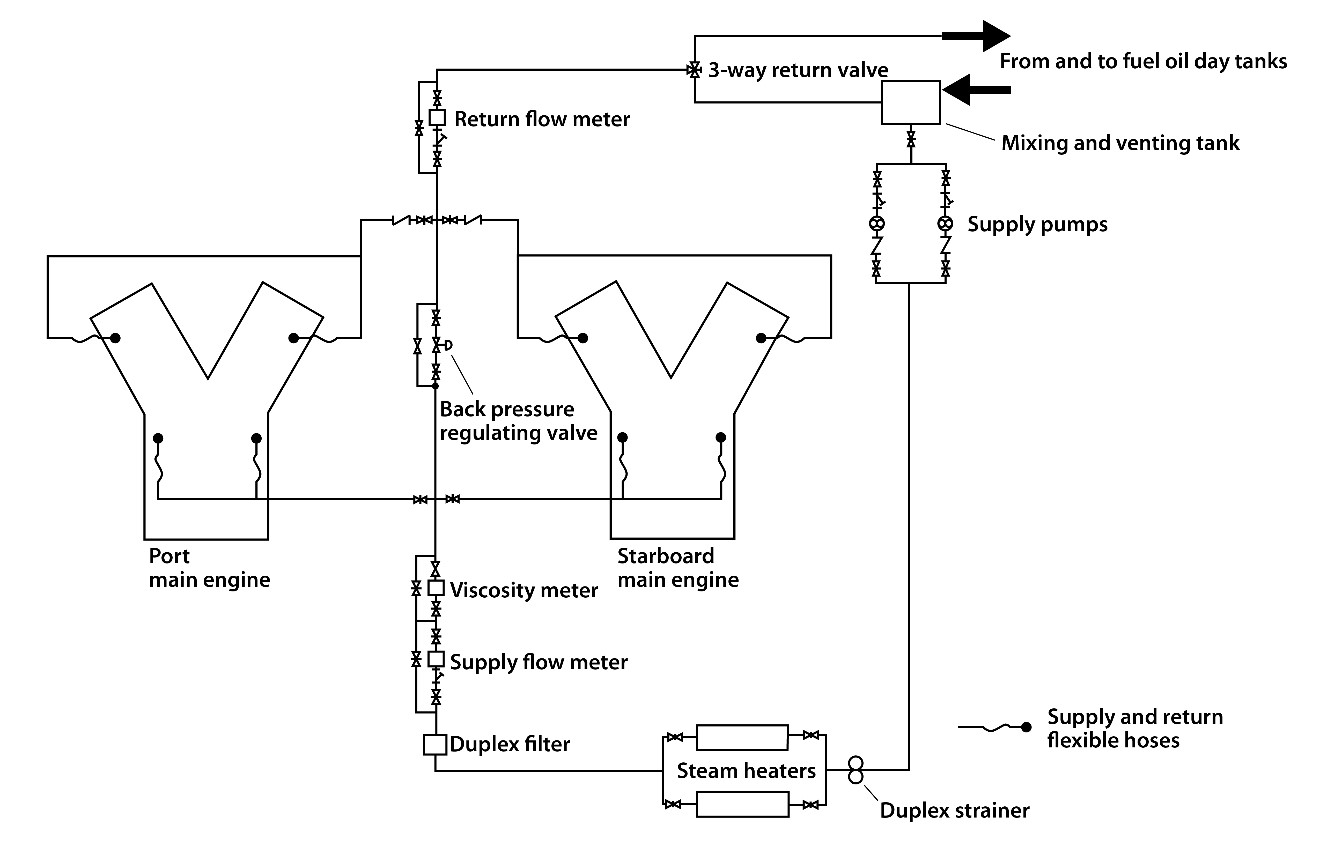 The main engines can be operated on either marine diesel oil or intermediate fuel oil.Footnote 3 The fuel supply system feeds both main engines and is fitted with an automatic back‑pressure regulating valve that is designed to maintain a constant fuel oil pressure of 25 to 35 psi in the system. The fuel supply system (Figure 7) consists primarily of hard piping, except where it connects to the engines. At these locations, there are flexible fuel hose assemblies. Each assembly is made up of a short flexible fuel hose with threaded-crimp fittings at either end. The threaded-crimp fittings attach the flexible hose to the hard piping (Figure 8).