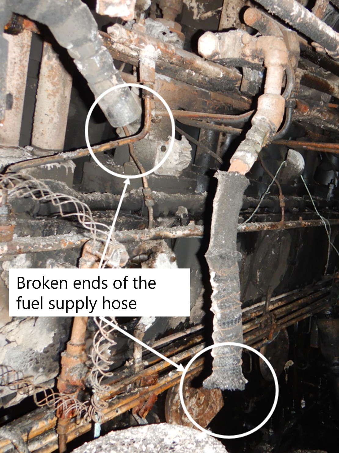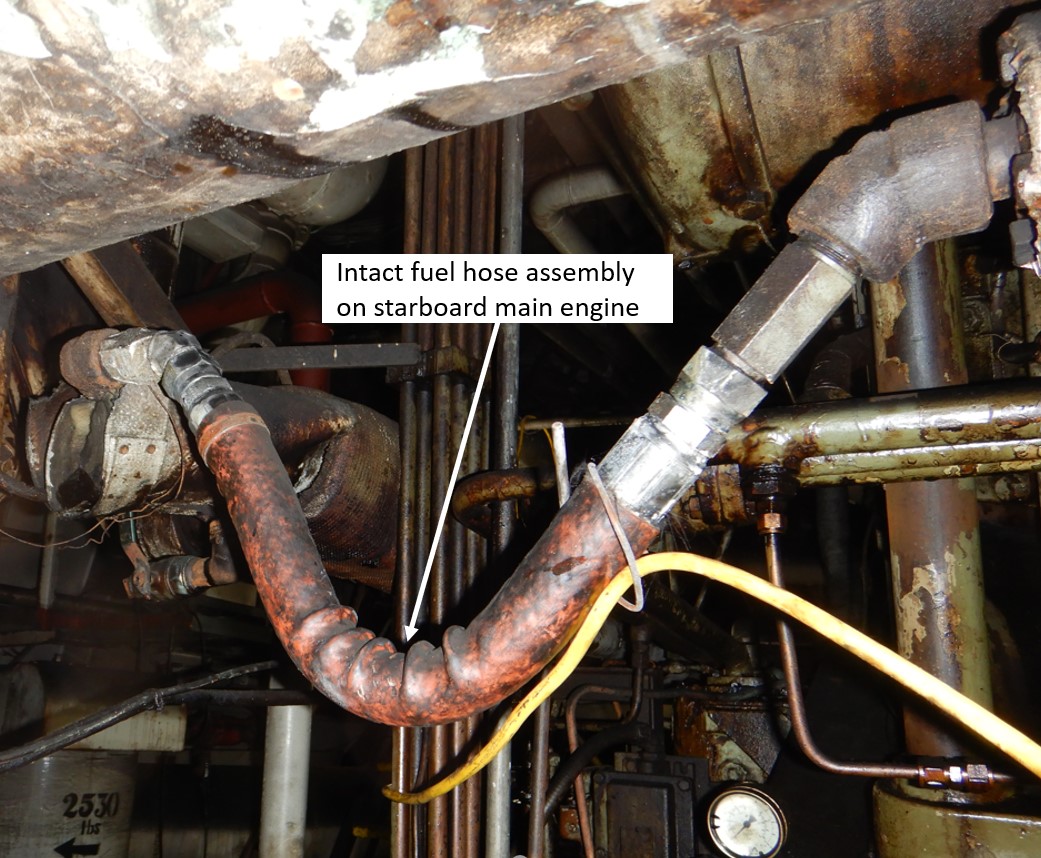 - A fuel hose assembly of unknown origin and integrity failed on the port main engine, which allowed fuel oil to spray on to local sources of ignition, leading to the fire.
