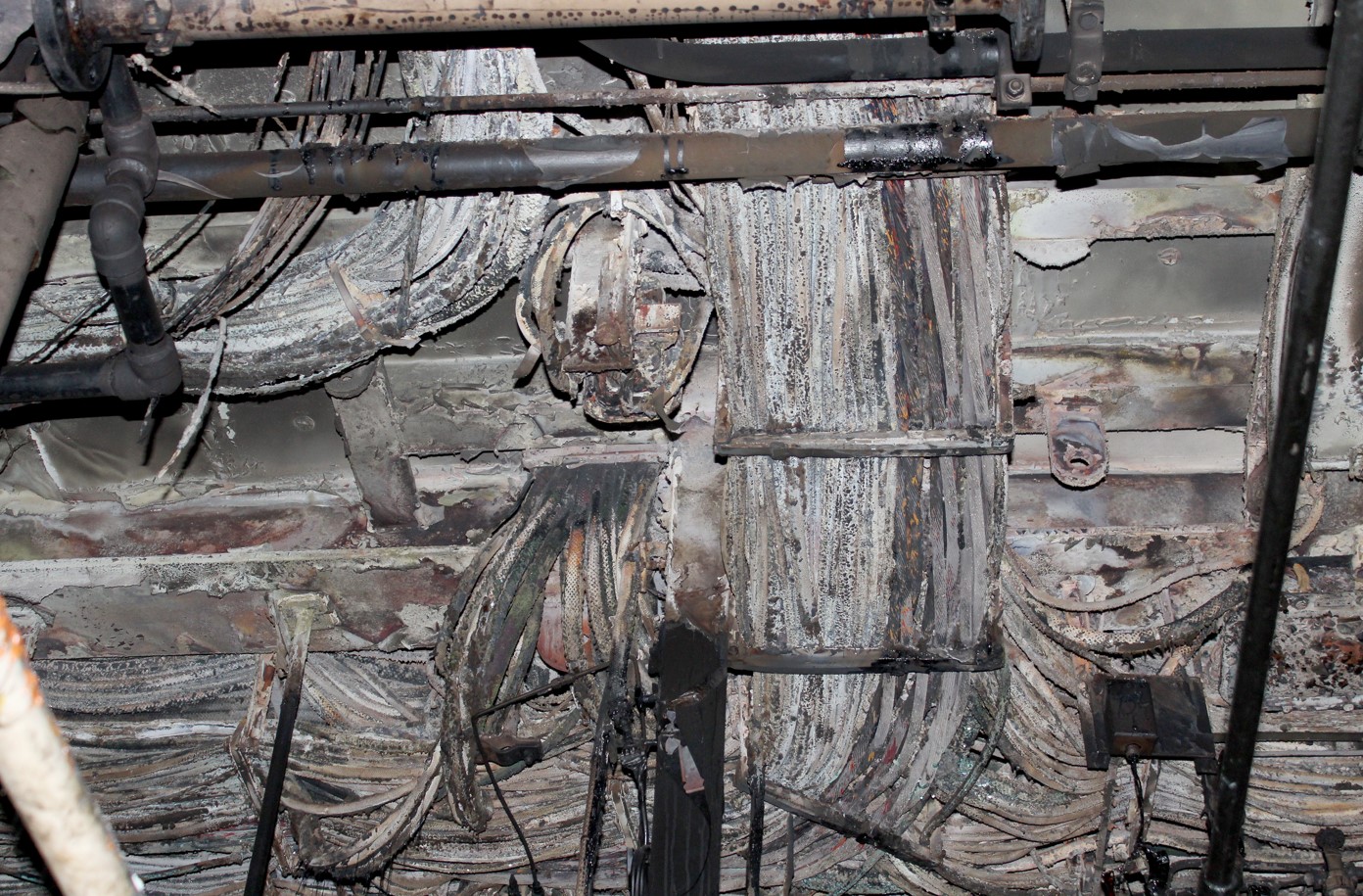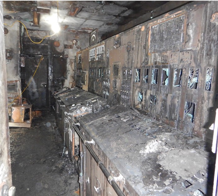 The Tecumseh’s engine room and associated machinery sustained heat, smoke, and soot damage from the fire. The port main engine (Figure 9) and various electrical cables and equipment (Figure 10) sustained moderate to severe fire damage, while the ECR, including the main switchboard and control consoles, was completely destroyed (Figure 11).
