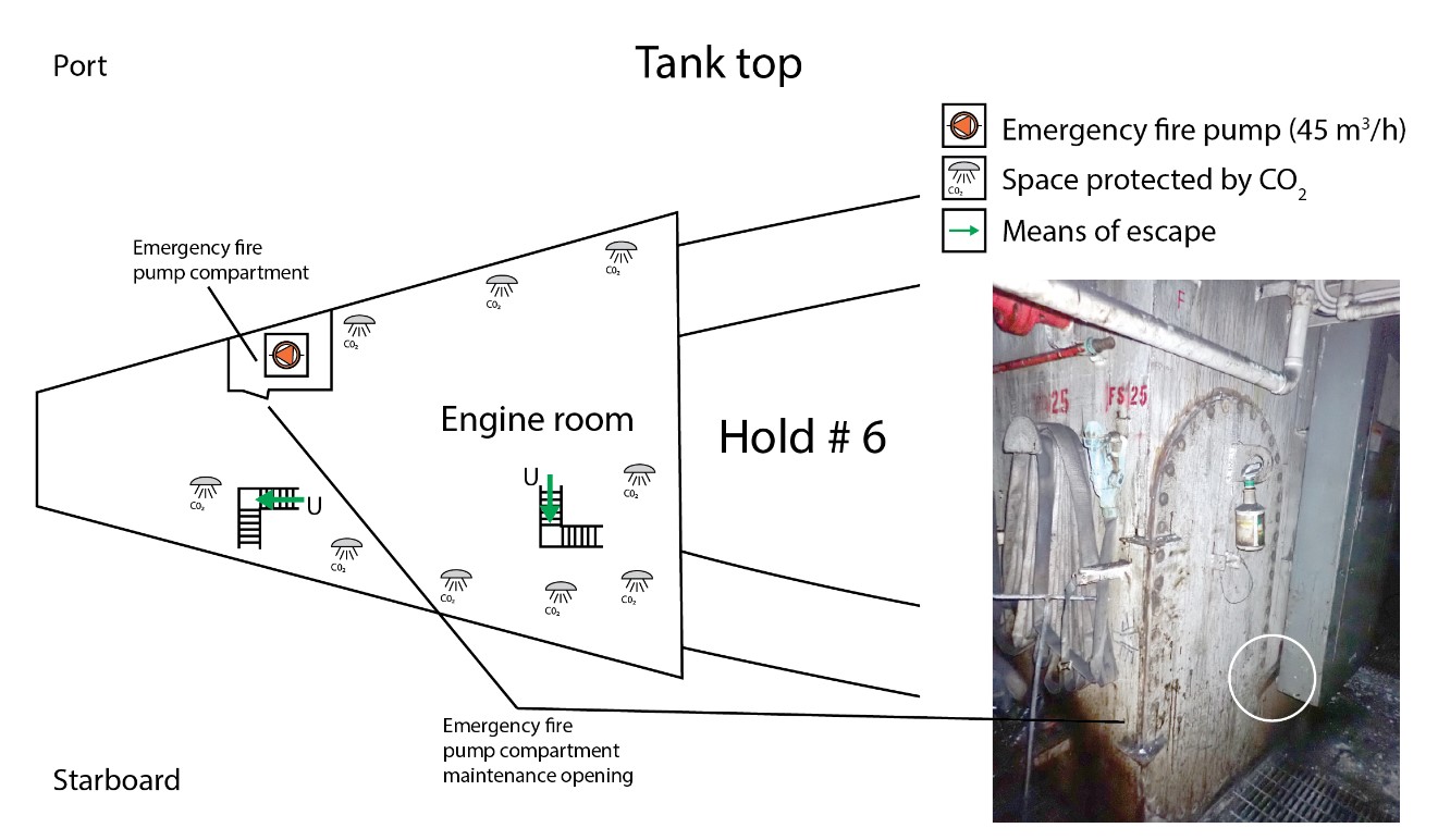 - Approximately 3 hours after the CO2 was released, crew re-entered the engine room from the steering gear flat with a charged fire hose. Re-entry into the engine room allowed fresh air to enter the engine room, which most likely re-ignited the fire.